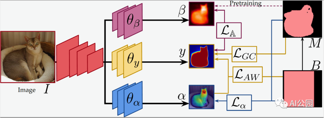 研究人员训练模型的架构。由GrabCut分割算法(M)提供的包围框本身(B)和粗分割的位置有助于监督目标分割网络(θy)和两个辅助网络(θa和θb)的训练。