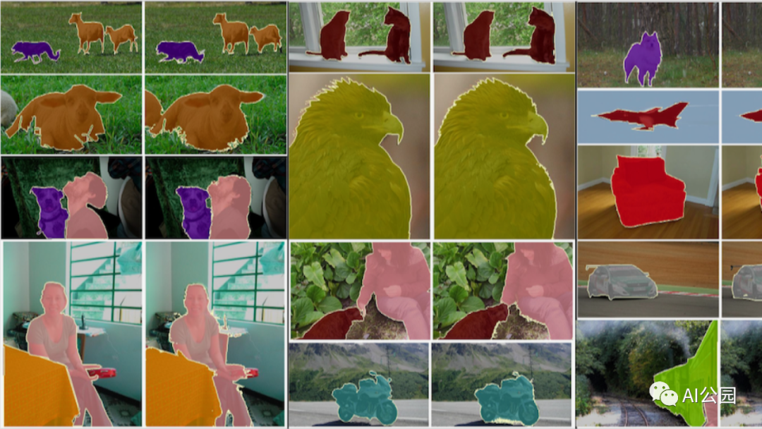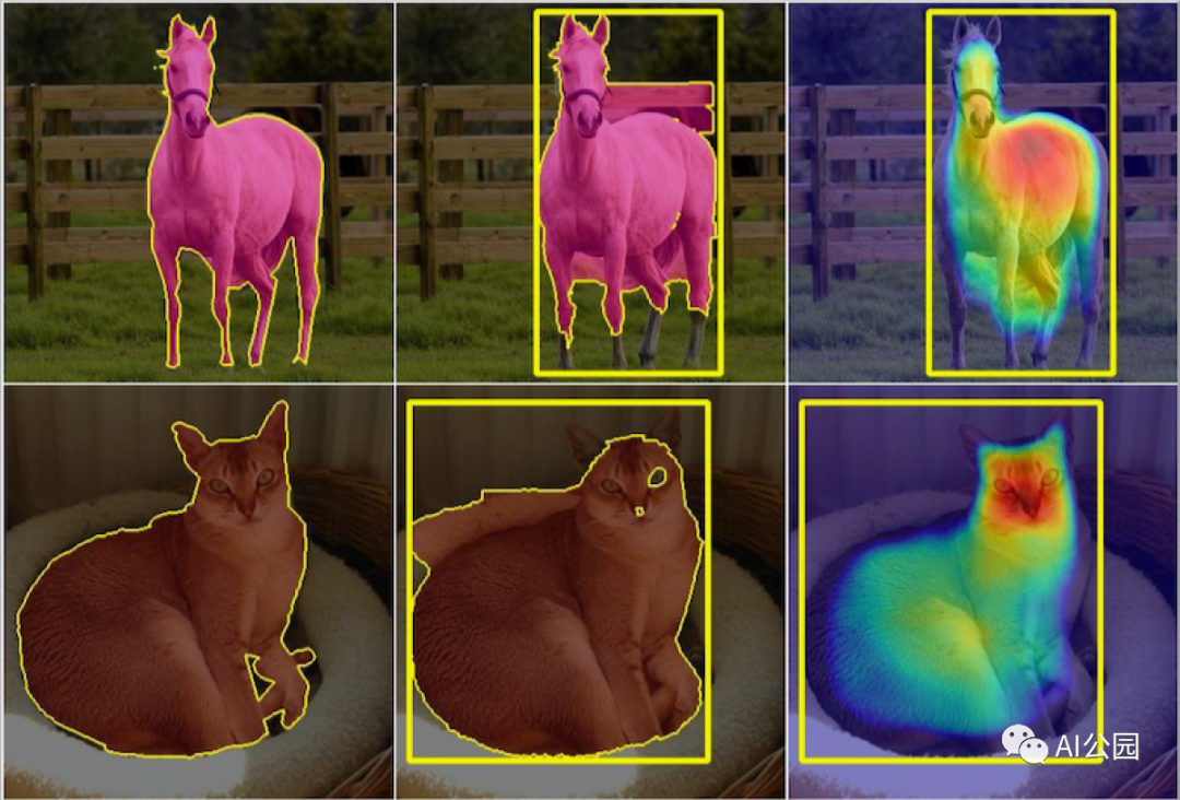 从左到右:手动分割图像,边界框与GrabCut算法提供的粗分割相结合,边界框与研究人员的标签特定注意网络输出相结合。在第三对图像中,光谱的红色端表示经常出现在带有特定标签的边界框内的图像特征。在训练过程中,目标分割网络应特别注意这些特征。