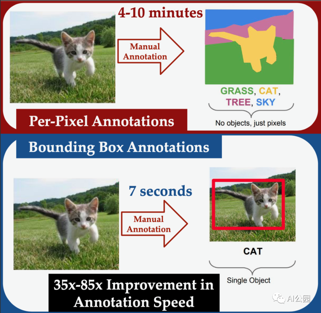 基于机器学习的语义分割系统通常是在目标边界已经精心手工标注过的图像上训练,这是一个耗时的操作。另一方面,目标检测系统可以对图像进行训练,在这些图像中,目标被称为边界框的矩形框框起来。对于人类标注者来说,手动分割一幅图像平均花费的时间是标记边界框的35倍。