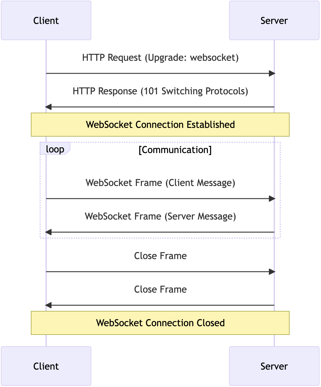 WebSocket 连接建立后,客户端和服务器之间可以进行全双工通信。他们之间可以互相发送 WebSocket 帧,包含各自的消息。 -