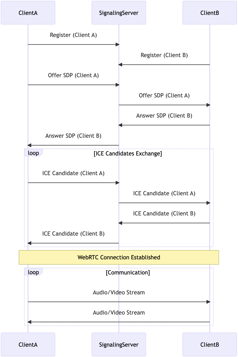通信过程中,客户端 A 和客户端 B 可以直接交换音频和视频流。