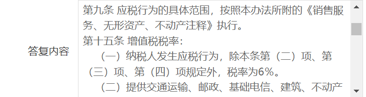 (一)纳税人发生应税行为,除本条第(二)项、第(三)项、第(四)项规定外,税率为6%。