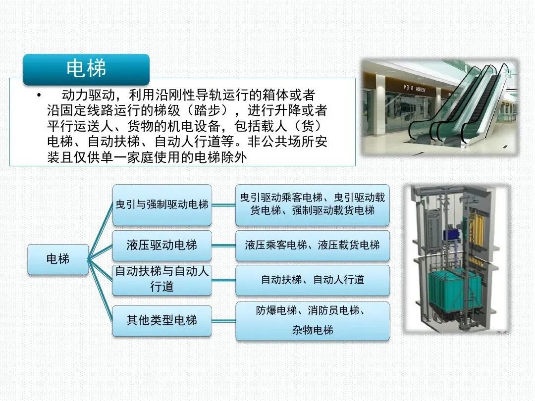(4)电梯,是指动力驱动,利用沿刚性导轨运行的箱体或者沿固定线路运行的梯级(踏步),进行升降或者平行运送人、货物的机电设备,包括载人(货)电梯、自动扶梯、自动人行道等。非公共场所安装且仅供单一家庭使用的电梯除外。
