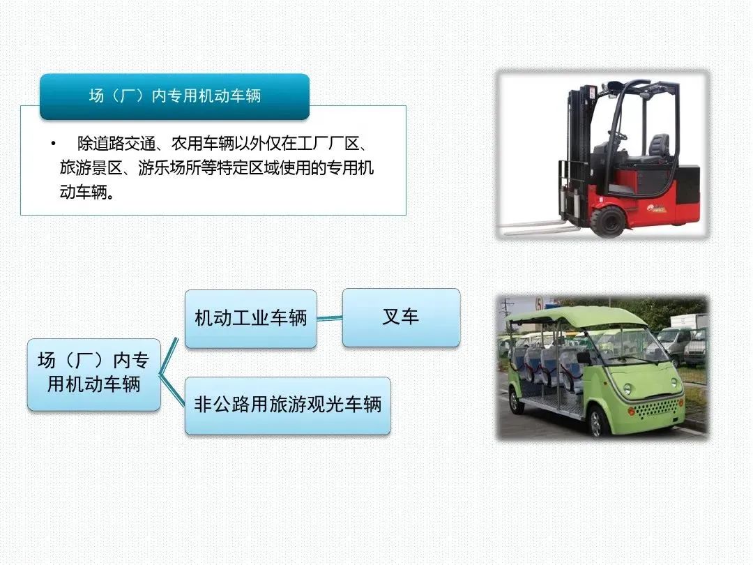 (8)场(厂)内专用机动车辆,是指除道路交通、农用车辆以外仅在工厂厂区、旅游景区、游乐场所等特定区域使用的专用机动车辆。