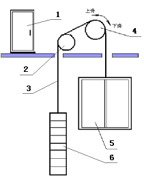 1.控制柜;2.导向轮;3.曳引钢丝绳;4. 曳引轮;5.轿厢;6.对重