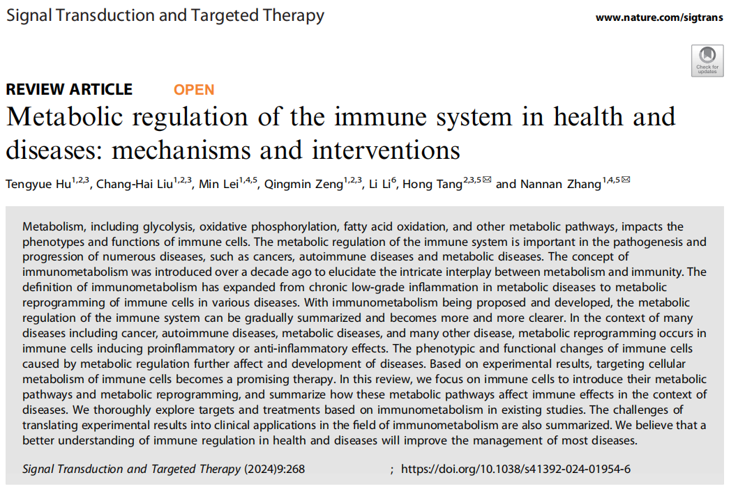 标题:Metabolic regulation of the immune system in health and diseases: mechanisms and interventions