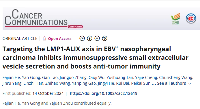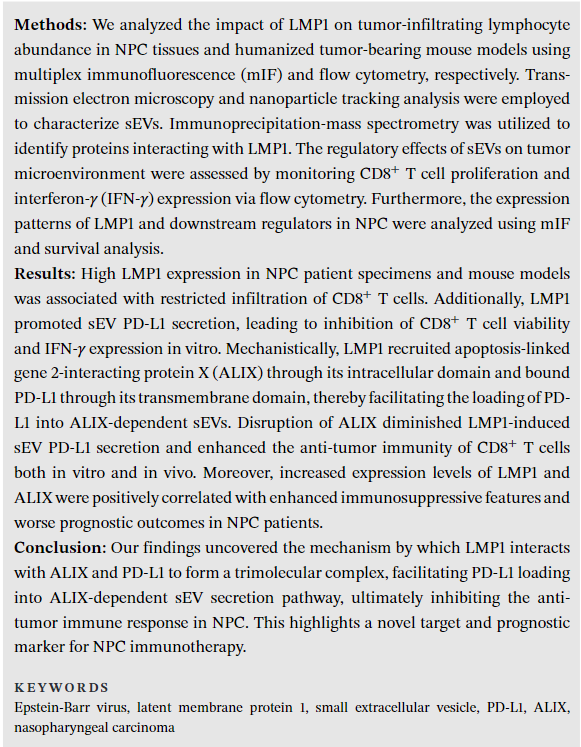 标题:Targeting the LMP1-ALIX axis in EBV+ nasopharyngeal carcinoma inhibits immunosuppressive small extracellular vesicle secretion and boosts anti-tumor immunity