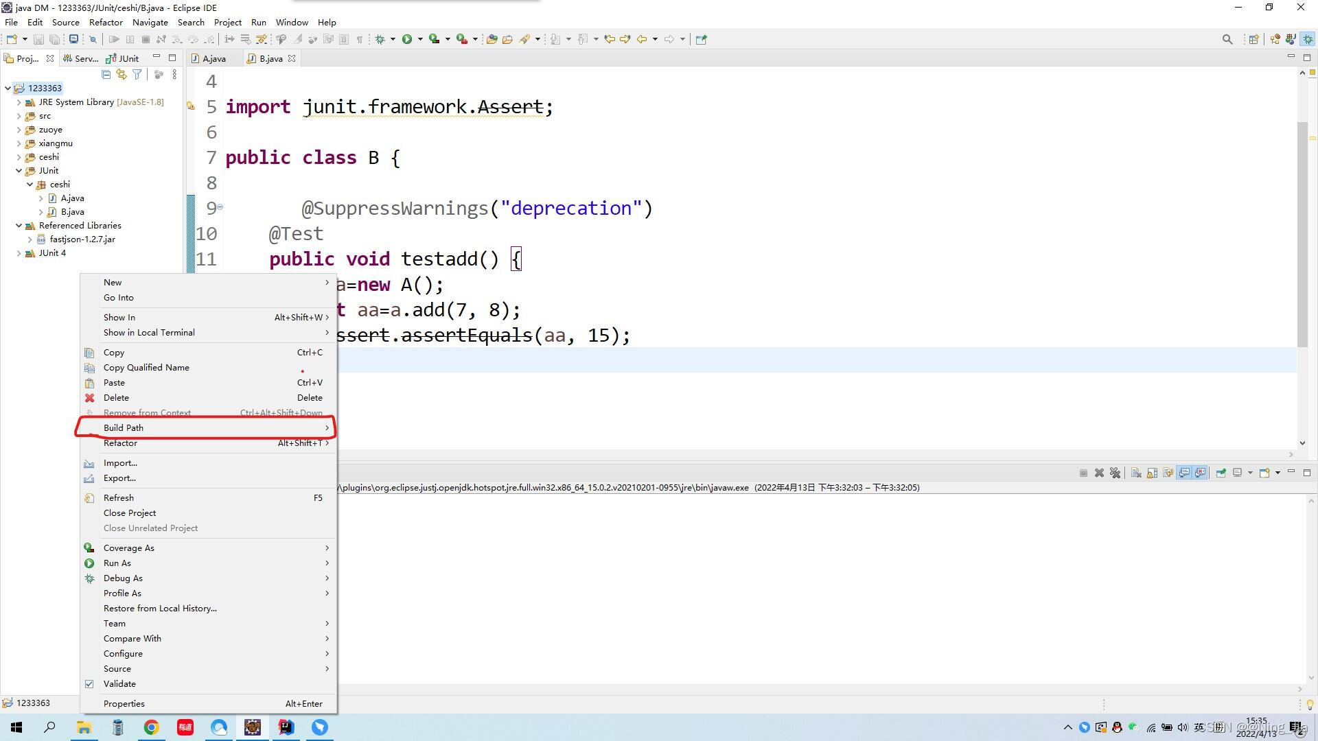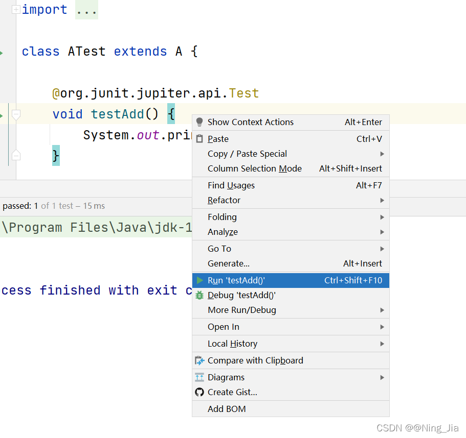 如何运行 Junit呢?鼠标放在需要测试的方法中,右键,Run As —->JUnit Test