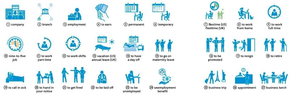 | 7 | flextime (US) flexitime (UK) | /ˈflɛkstaɪm/ /ˈflɛksɪtaɪm/ | n. 弹性工作时间 |