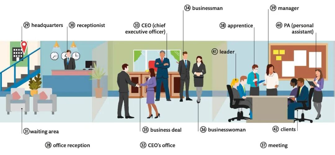 | 28 | office reception | /ˈɔfəs rɪˈsɛpʃən/ | n. 办公室接待处 |