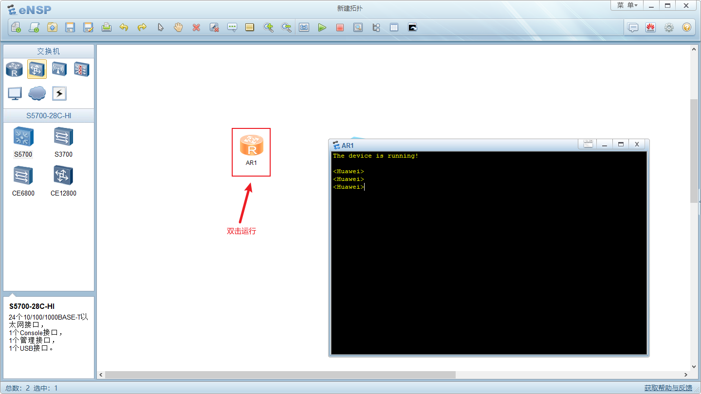 双击运行设备,可以进入到该设备命令行。至此,安装成功,可以使用该软件进行网络实验了。