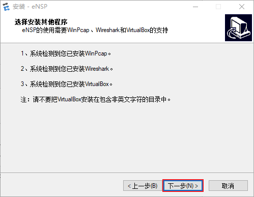 安装eNSP需要先安装三个依赖软件才能运行,分别是VirtualBox、WinPcap、Wireshark
