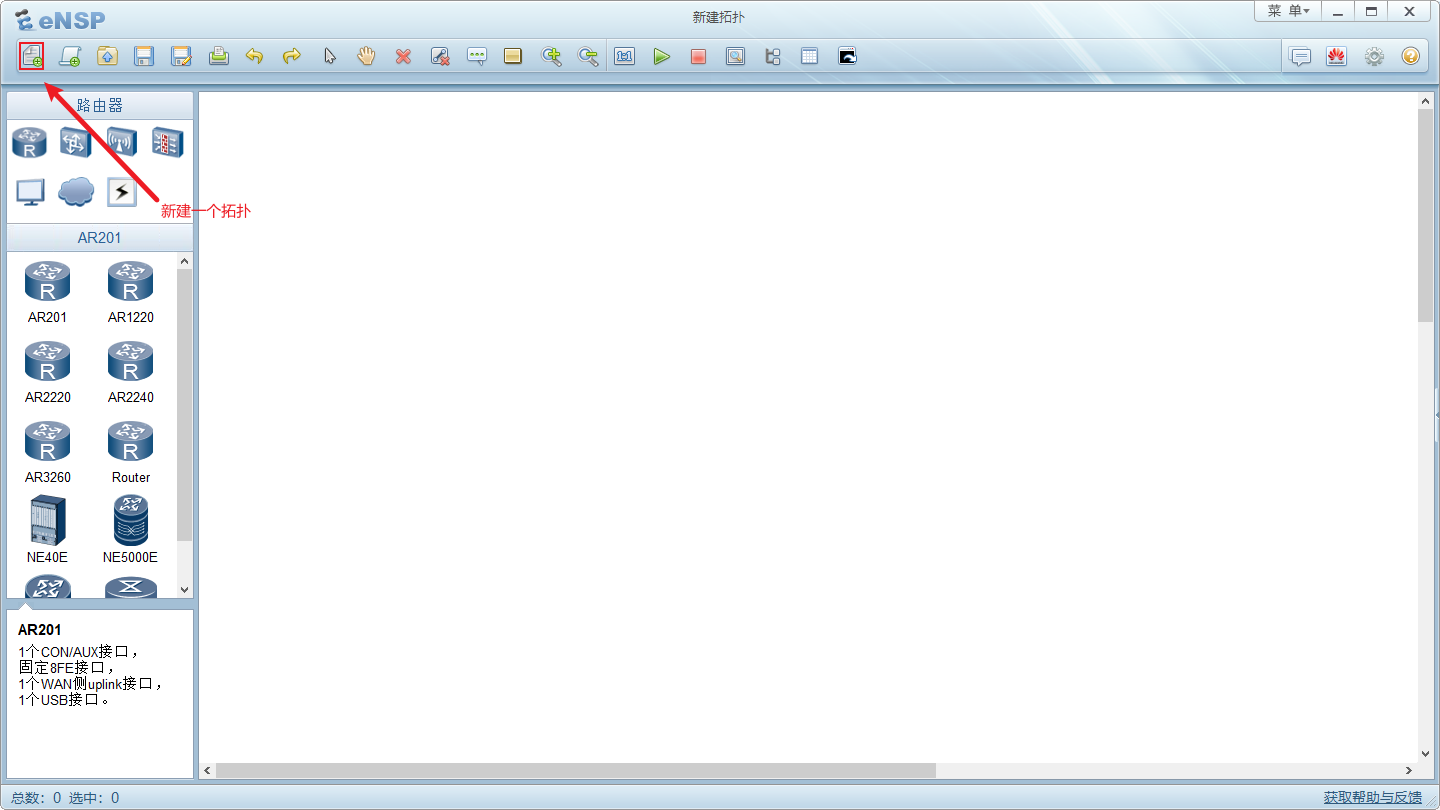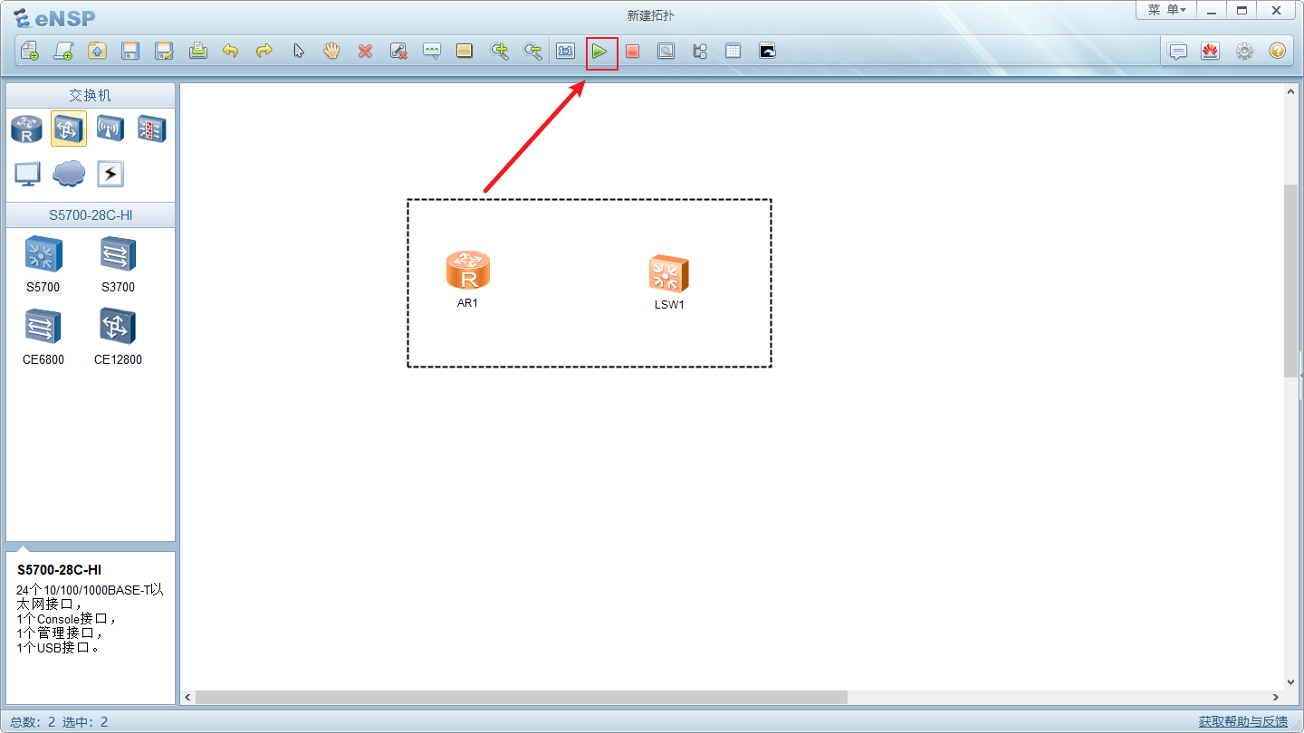拖入一个交换机和路由器,鼠标框选住设备,点击绿色运行箭头启动设备