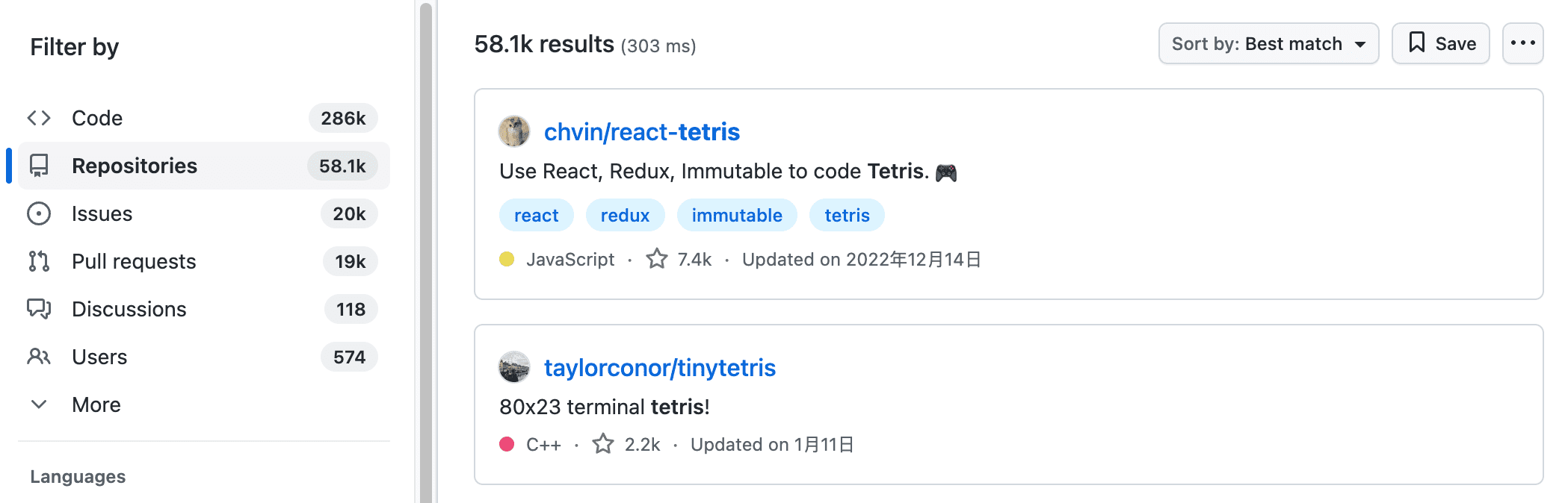 写这篇文章的时候,我发现一款经典的游戏会有很多同类型的开源项目,比如在 GitHub 上搜「俄罗斯方块」会找到 5 万个开源项目,但是能够做到和文中的「Hextris」和「react-tetris」,同等品质的开源项目却寥寥无几。