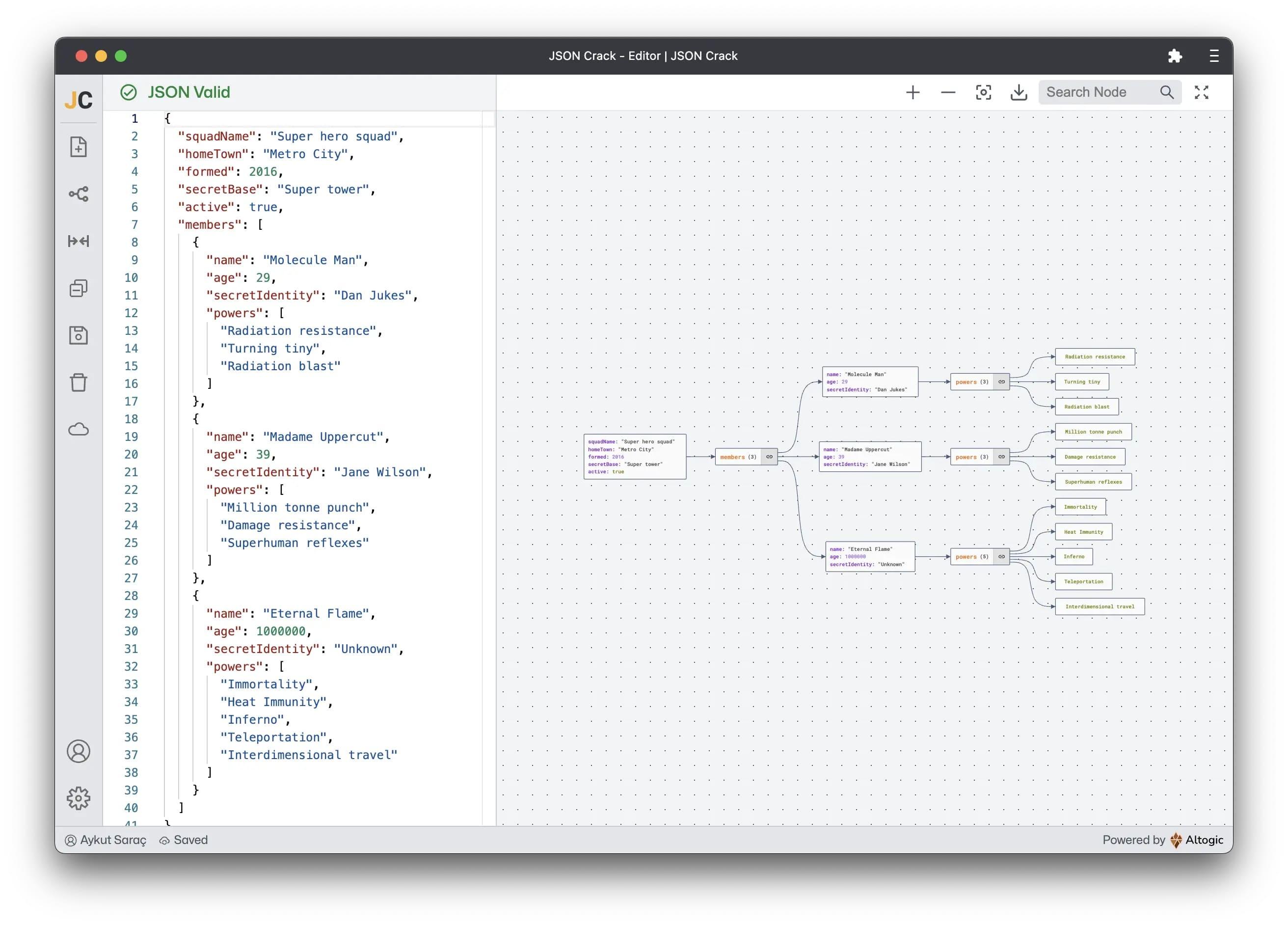 一款改变你查看 JSON 数据习惯的工具,它不是简单地格式化 JSON 数据,而是将其数据转化成节点,通过类似脑图的形式展示。支持放大/缩小、展开/收缩、搜索节点、导出图片等操作,你还可以通过部署服务,将它变成免费的在线服务。