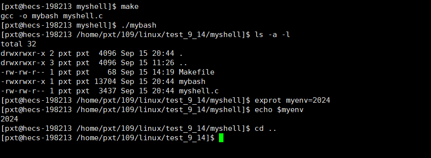 讯享网int main(){// shell是一个一直循环的程序while(1){char usercommand[NUM];char *argv[SIZE];// 获取输入int n = getUserCommand(usercommand, sizeof(usercommand));// 当获取输入时,返回一个小于0的数时,我们直接continue返回,不用往下继续走了if(n <= 0) continue;// 分割字符串 (strtok)commandSplit(usercommand, argv);// check Buildinn = doBuildin(argv);// 一般内建命令不会出错if(n) continue;// 执行命令execute(argv);}return 0;}