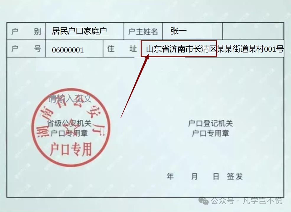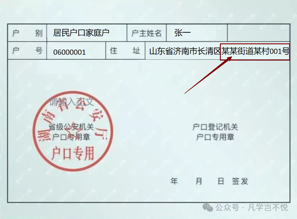 必填项。户口本首页上的“地址”,具体到门牌号,不能超过100个字。