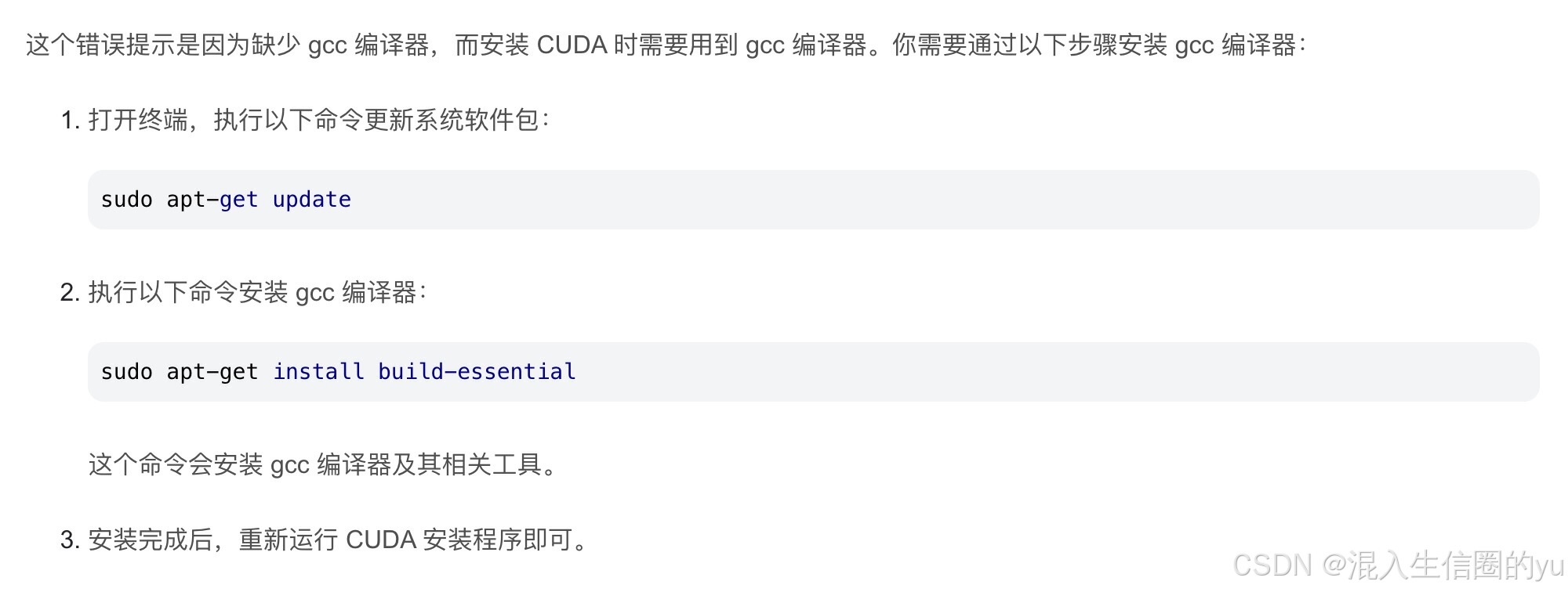 又或者更改gcc版本之类的ubuntu22.10安装cuda出错Failed to verify gcc version. See log at /var/log/cuda-installer.log for details.-CSDN博客(但是我尝试过更改版本这个方法,发现还是第一个方法“忽略”跟上面的第二个这个安装gcc编译器比较有用)