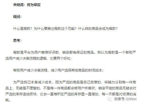 爆款必须是符合市场的,爆款商品它的市场前景是有前景的,它必须有盈利的空间,如果选择一款小而美的商品,对于严选这样的自营电商来说没法走成一个盈利的闭环,这样的爆款就是失败了。