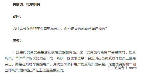 立即购买和加入购物车的位置、优先级和各大电商平台相反:配合平台满减活动,免邮费的活动,因为在购物车页面会显示各种优惠信息,只要用户多加几件商品就能享受优惠,并且免邮费的活动,所以对于严选加入购物车的按钮优先级更高。