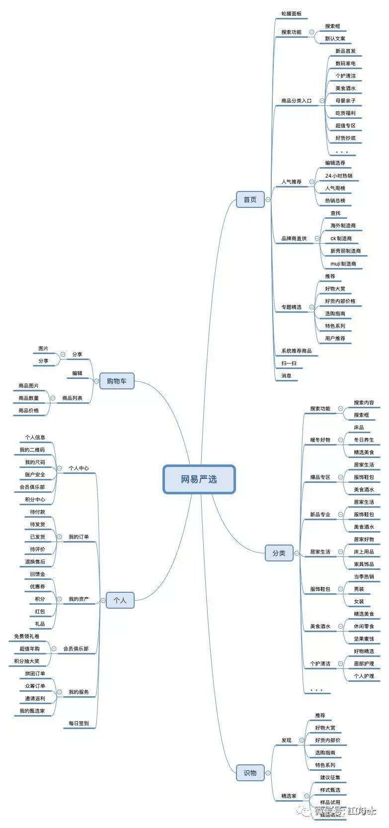 以下的是网易严选APP的功能框架图,将其分为首页、分类、识物、购物车、个人五个模块。