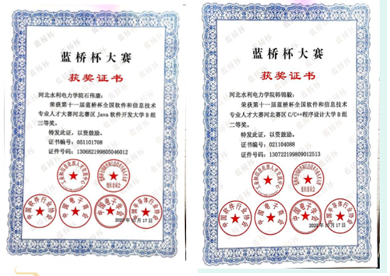 2、(1)2020年9月,指导学生参加第十一届蓝桥杯全国软件和信息技术专业人才大赛个人赛省赛,取得二等奖3项,三等奖2项;2021年4月,指导学生参加第十二届蓝桥杯,获得省级二等奖2项,三等奖3项,一等奖1项,其中1名同学进入国赛并获得国赛二等奖1项;2022年4月,指导学生参加第十三届蓝桥杯,获得省级一等奖1项,二等奖1项,三等奖5项,其中1名同学进入国赛。
