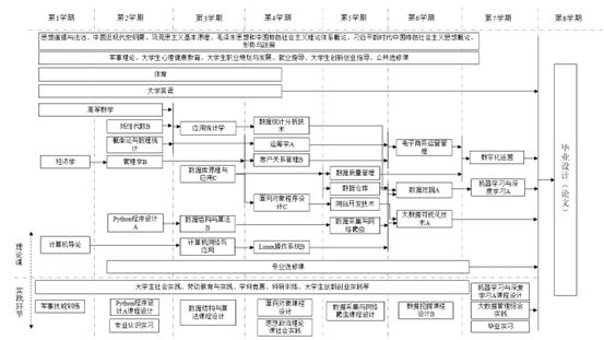 管理学、应用统计学、Python程序设计、数据结构与算法、数据库原理与应用、数据质量管理、数据采集与网络爬虫、数据挖掘、大数据可视化技术、数据统计分析技术等。