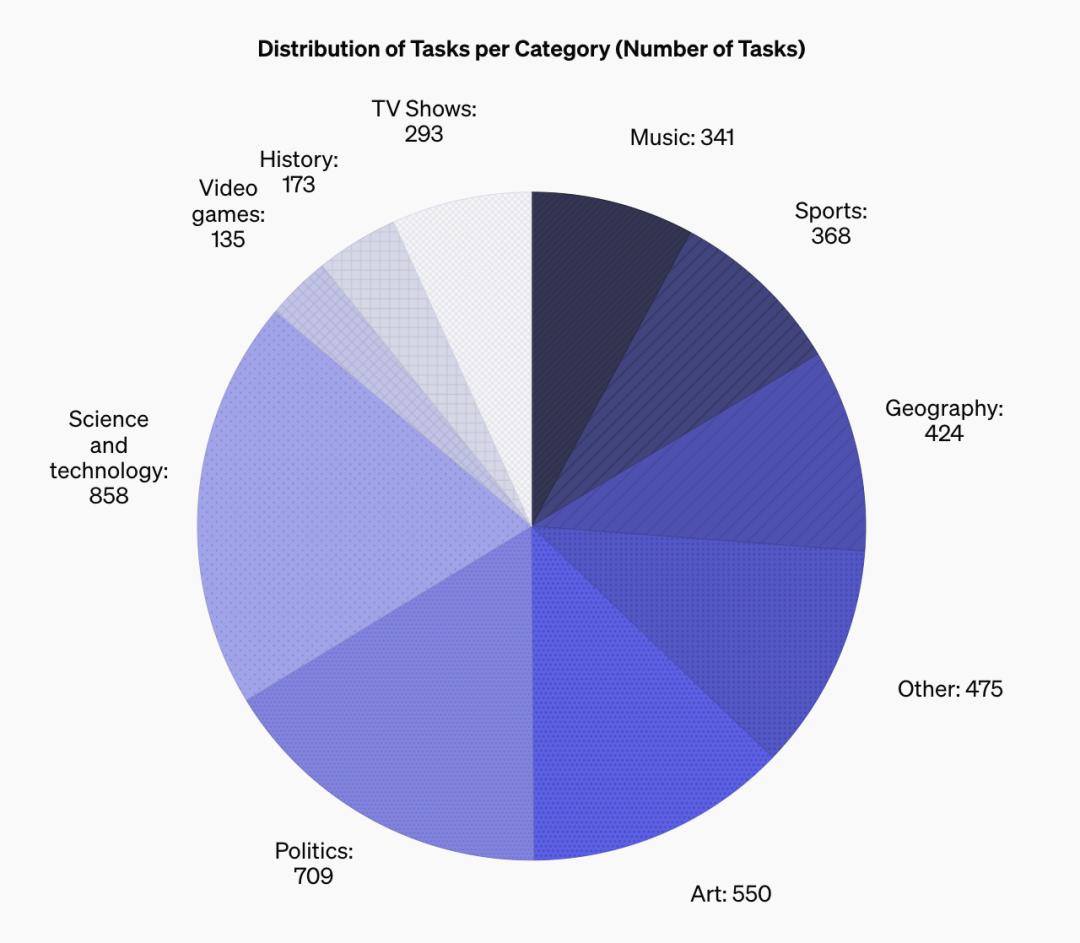 下面的饼图显示了 SimpleQA 基准中题目的多样性。