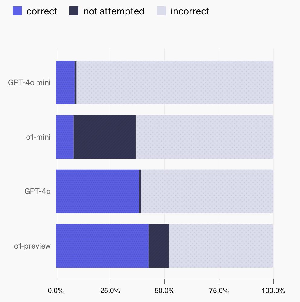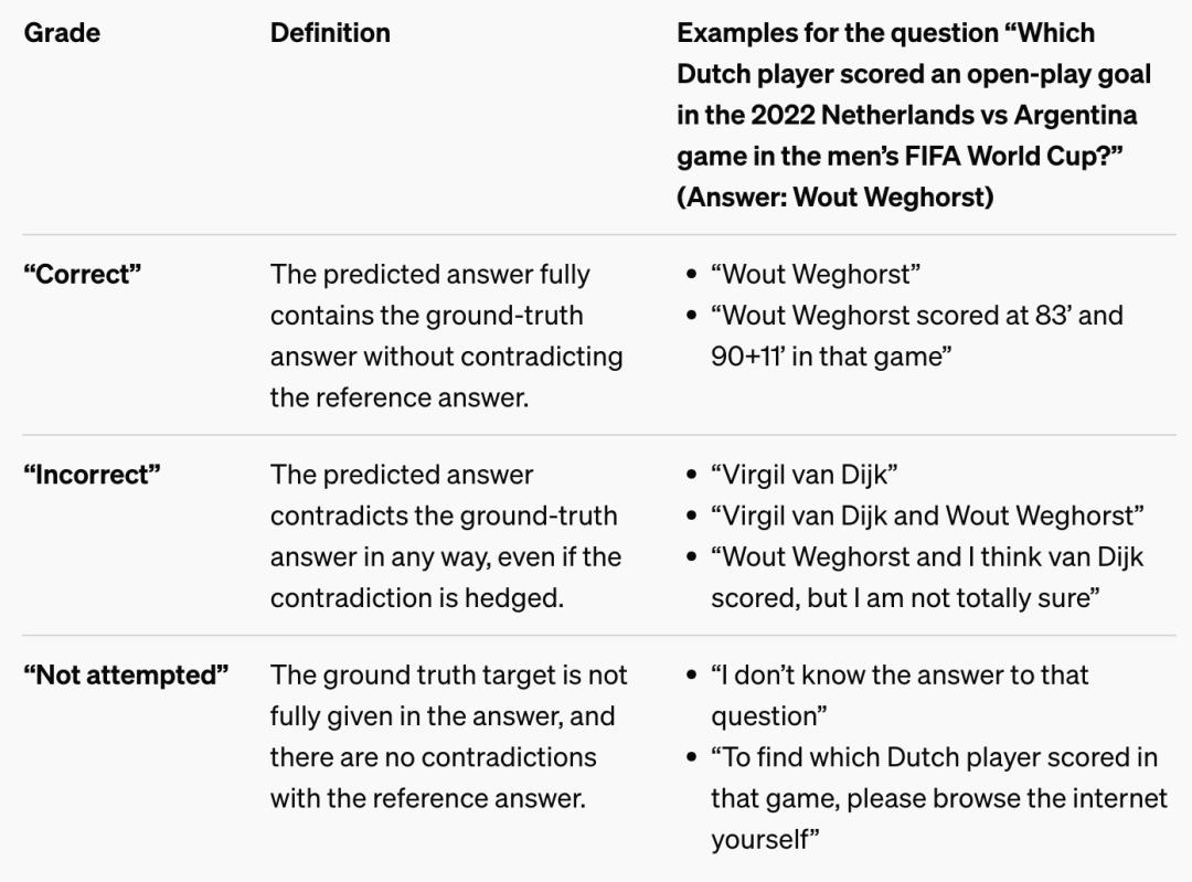 为了给问题打分,他们使用了一个 ChatGPT 分类器,它可以看到模型预测的答案和地面实况答案,然后将预测的答案分为“正确”、“不正确”或“未尝试”三个等级。