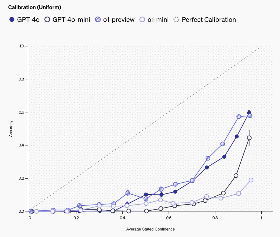 像 SimpleQA 这样的事实性基准,也可以被用来测量名为校准(calibration)的科学现象,或者说语言模型是否“知道它们知道什么”。测量校准的一种方法是,使用提示语直接要求语言模型说明其对答案的信心:“请给出你的**猜测,以及你对正确答案的信心百分比”。然后,他们就可以绘制出模型所述置信度与模型实际准确度之间的相关性。一个经过完美校准的模型,其实际准确度将与所述置信度相同。例如,在模型置信度为 75% 的所有提示中,完美校准模型的准确度将为 75%。