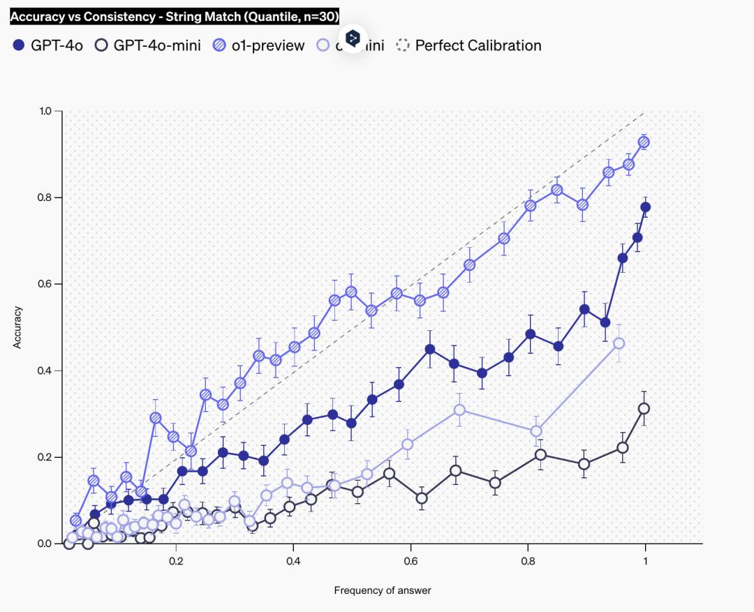 在下图中,他们展示了语言模型的校准情况,以其回答频率来衡量。在这里,他们只是使用字符串匹配将语言模型中的不同答案归为一组。可以看到,在所有模型中,准确率随着频率的增加而增加,而 o1-preview 的校准水平最高,即回答的频率与回答的准确率大致相当。与上述置信度图的校准类似,可以再次看到 o1-preview 比 o1-mini 的校准程度更高,而 gpt4o 比 o1-mini 的校准程度更高。