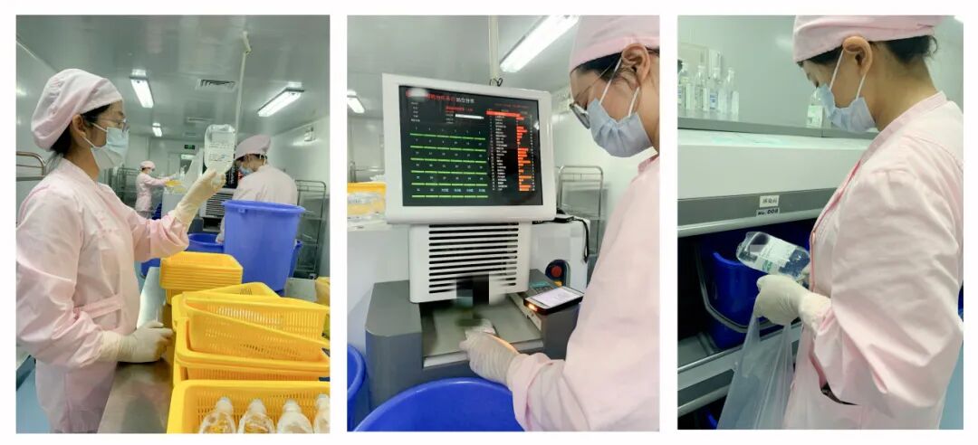 药品调配结束后传出洁净区,由成品核对药师复核,确保每一瓶成品输液的安全,随后成品输液通过智能分拣机扫描识别,按科室进行分拣。