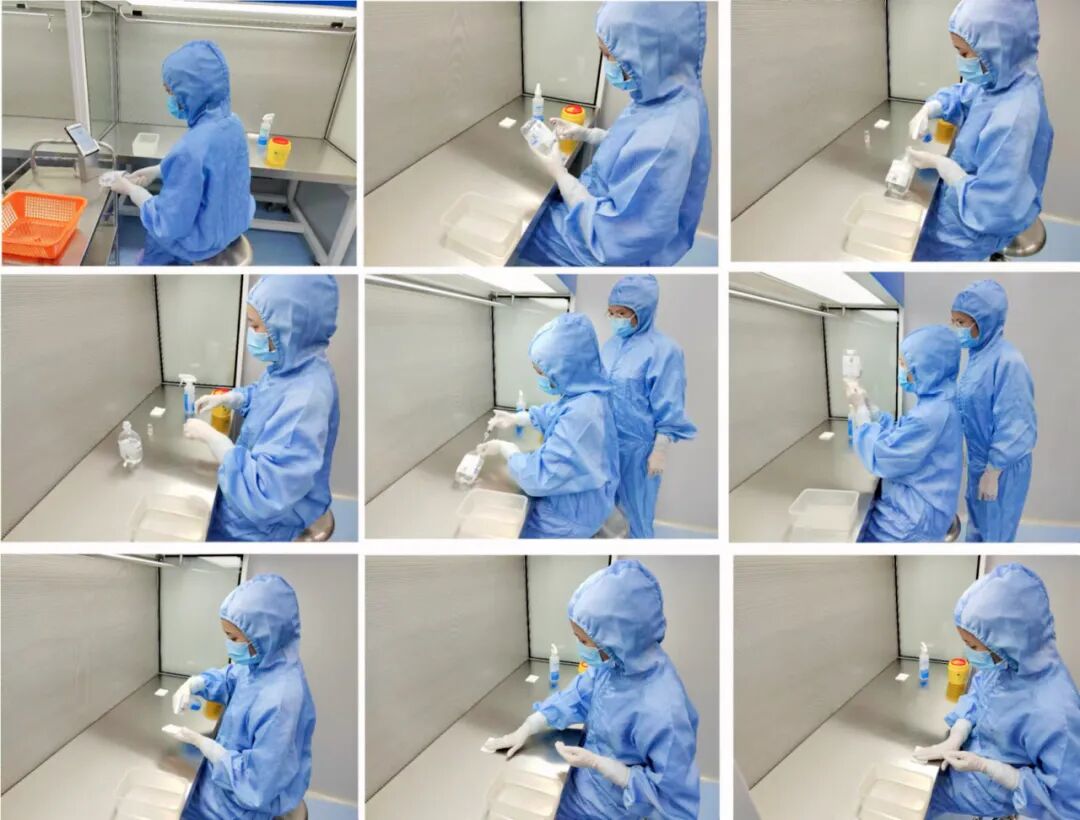 调配药师穿着洁净服,在局部百级的洁净环境下,再次核对药品信息无误后,严格按照无菌操作技术要求,规范地进行各类药品的混合调配操作工作(负责药品混合调配的药师必须通过严格的无菌操作及调配操作培训考核后才具备调配资格)。