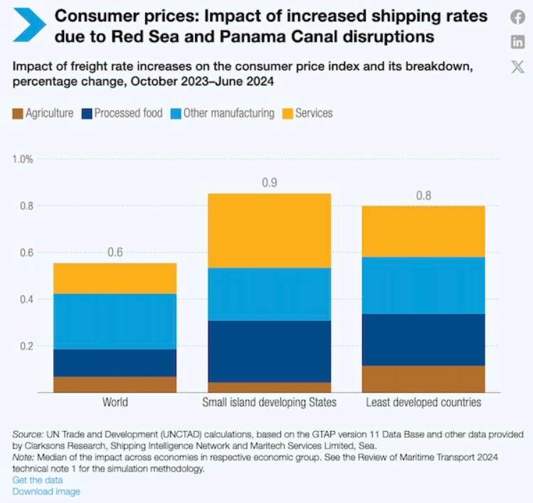 各国在应对干扰和成本上升方面的表现差异显著,小岛屿发展中国家(SIDS)和最不发达国家(LDCs)受到的冲击最为严重。分析显示,若红海与巴拿马运河的干扰导致集装箱运价上涨趋势延续至2025年底,全球消费者价格或上涨0.6%,而SIDS的价格涨幅可能高达0.9%,加工食品价格更可能飙升1.3%。鉴于SIDS经济高度依赖航运进口必需品,且过去十年海运连通性平均下降9%,其孤立状态日益加剧,目前与全球航运网络的连通性平均低于非SIDS国家十倍。