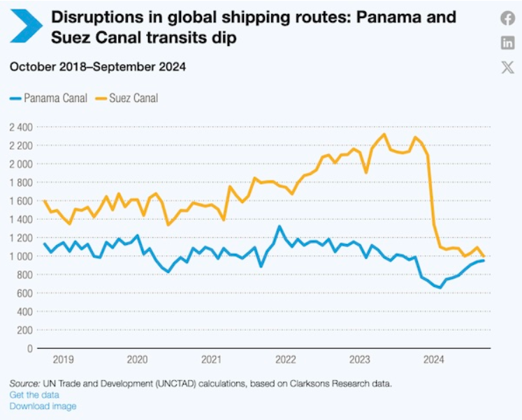 主要海上航线遭受严重干扰,导致货物延误、航线改道及运输成本飙升。巴拿马运河和苏伊士运河是全球贸易的重要动脉,到2024年年中,这两条运河的运输量与高峰期相比下降了50%以上。造成这一下降的原因是干旱天气导致巴拿马运河水位下降,以及红海地区爆发的冲突影响了苏伊士运河通航。与2023年底相比,穿越亚丁湾和苏伊士运河的船舶吨位分别锐减76%和70%。