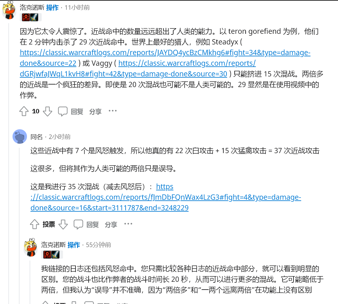 你可以在血魔上看到他们的猎人近战获得了 570 dps。WCL 方面真的无能为力(除了禁止所有中文日志,如果世界其他地方开始这样做,这并不能解决问题),因为这是实际的作弊。需要让暴雪注意到这一点,这样插件(和大量使用 AHK)才能被禁止,滥用它的玩家也会被禁止。