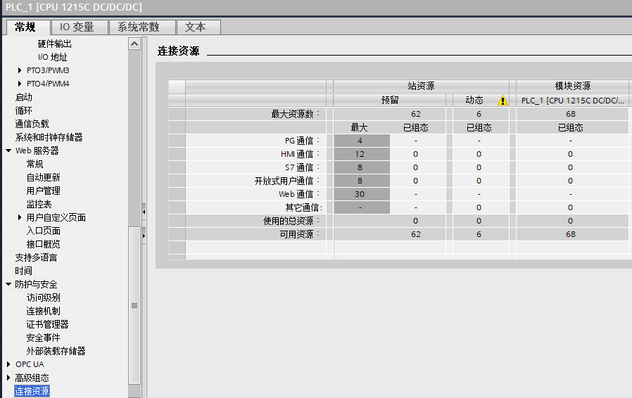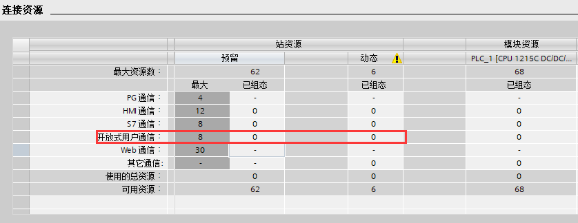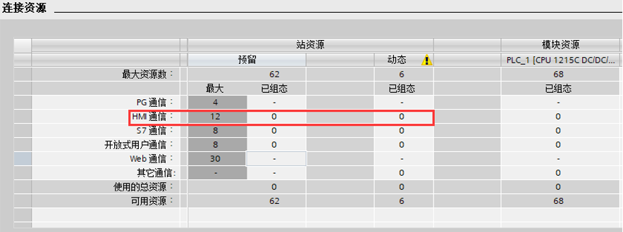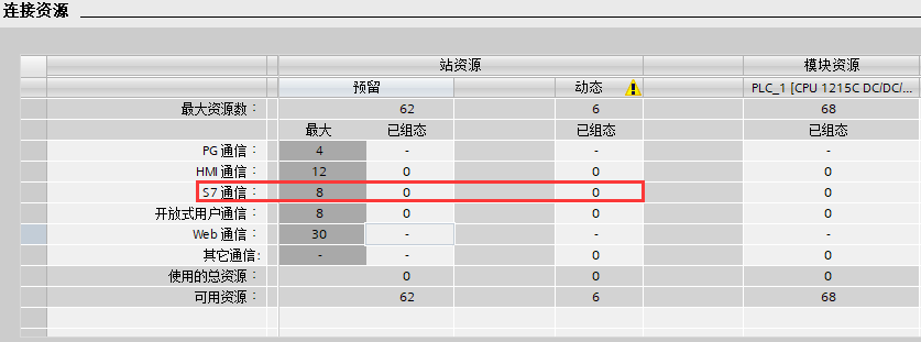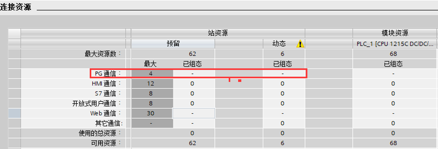 注意:连接资源并不等于连接个数,例如“PG通信”最大分配了4个资源,并不是可以连接4个PG设备。