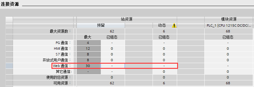 S7-1200CPU预留了30个Web服务器的连接资源(如图6),可用于Web浏览器访问。一个Web服务器占有10个连接资源。