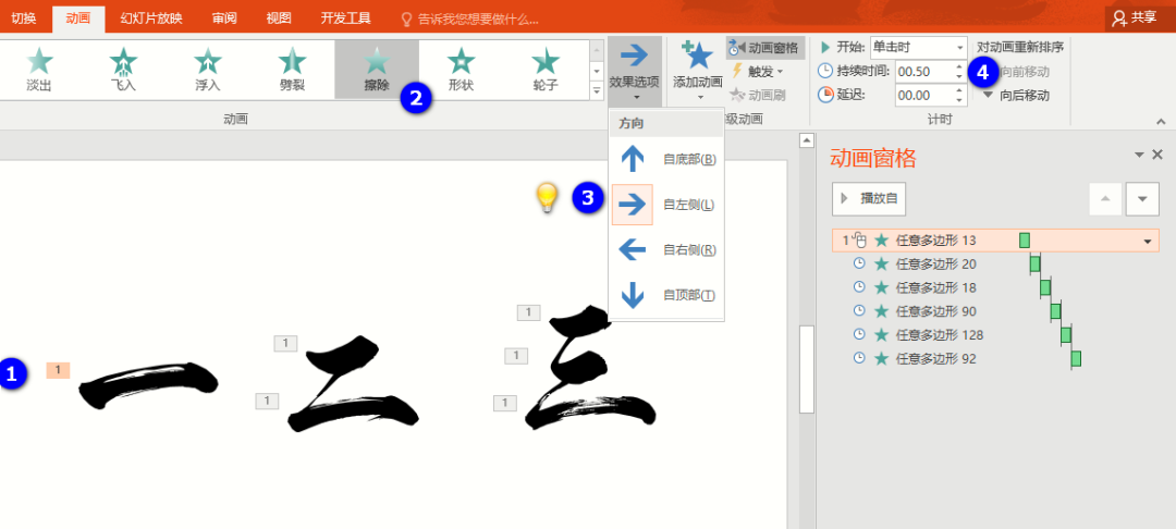 接着我们开始给拆分后的笔画添加擦除动画,需要重点注意的是效果选项的方向问题,比如“一”是从左往右写的,“二”是从上往下写的,所以方向是不同的。按照步骤设置好方向接着就是把持续时间也设定一下。这里的时间不固定,因为最终的效果要根据文字的笔画多少来决定。