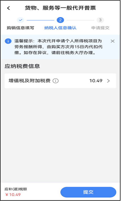 货物、服务等一般代开普票时,若个人所得税品目为劳务报酬、稿酬、特许权使用费所得时,纳税人信息确认界面温馨提示:本次代开申请个人所得税项目为劳务报酬、稿酬、特许权使用费所得时,由购买方次月15日内代扣代缴,如存在异议,请前往税务大厅办理。若为其他个人所得税品目不显示温馨提示。