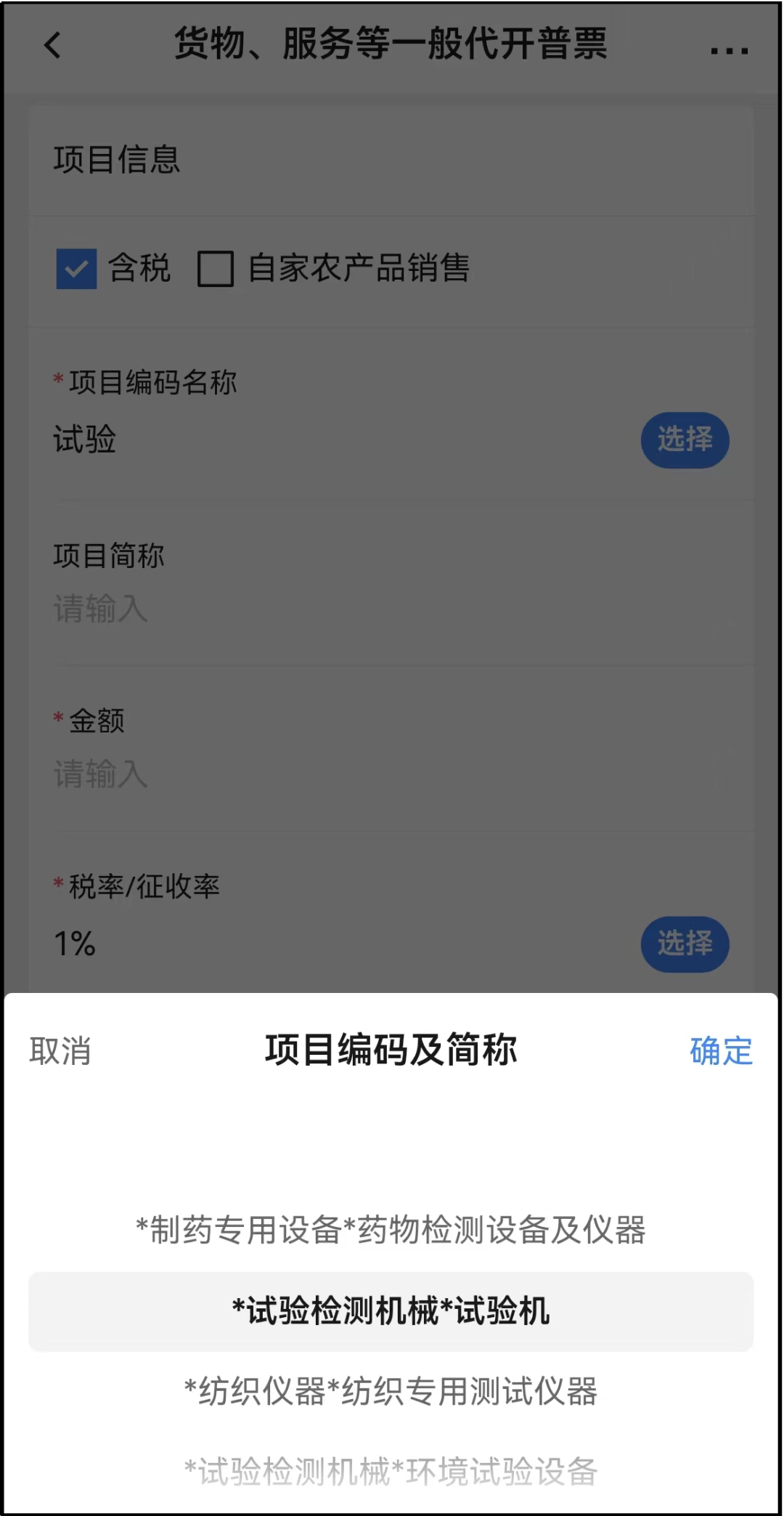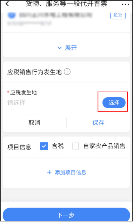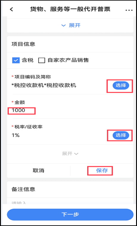 注意:填写“项目编码及简称”时,第一次需要先输入关键字再点击选择项目。若是第二次开票,如果之前曾开具过此项目,就可以不输入关键字,只需点击“选择”从中选择项目即可。