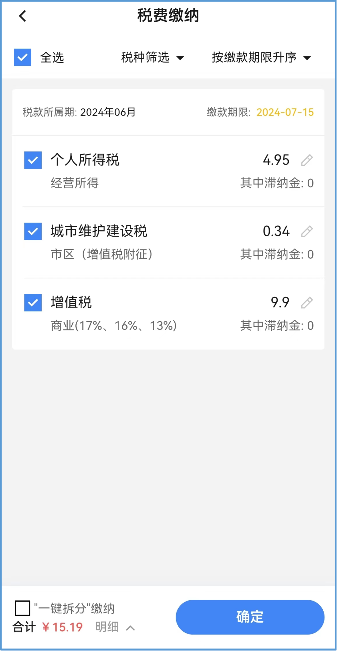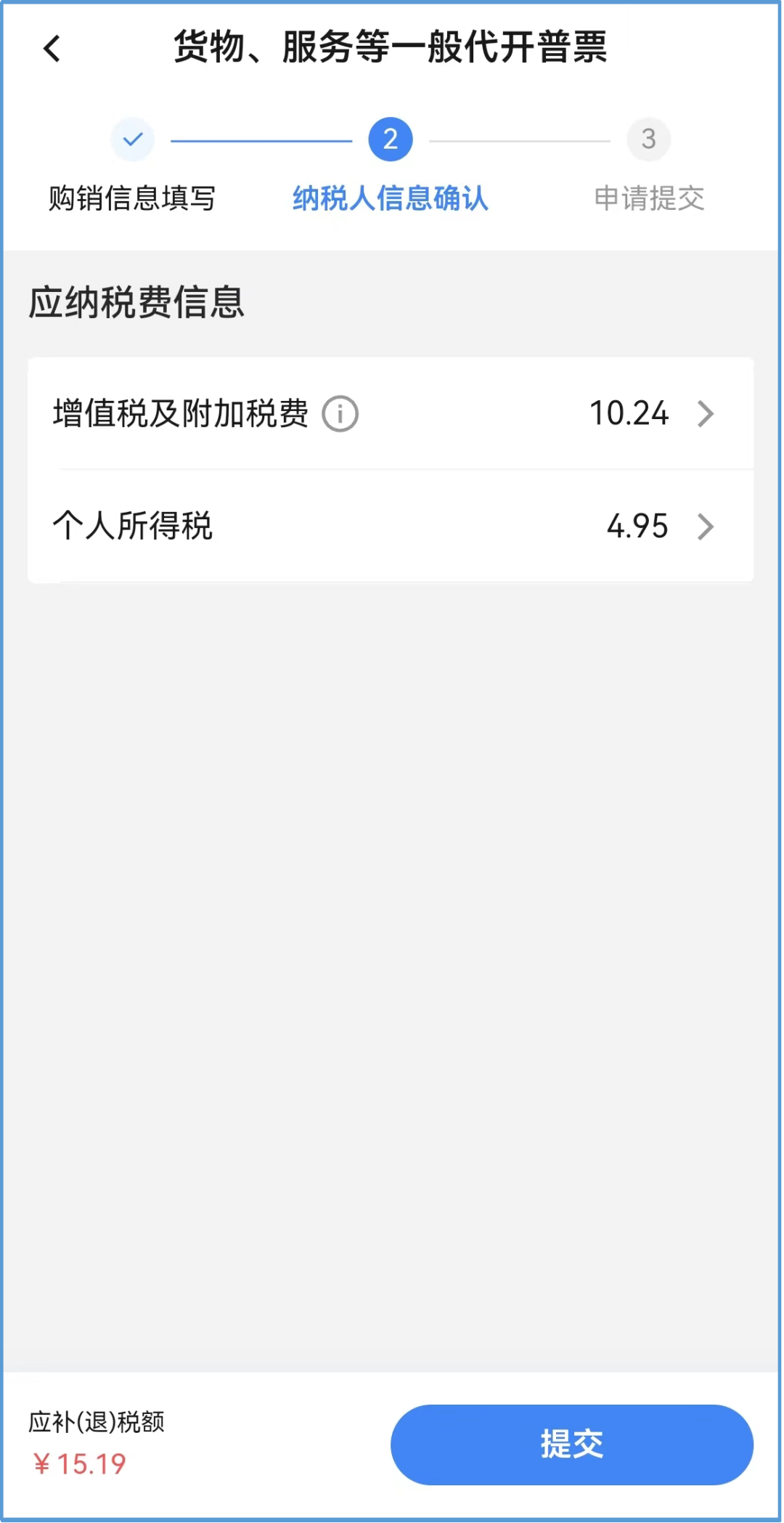 7.纳税信息确认:系统根据填写的发票信息自动加载应纳税款信息,纳税人确认无误后点击【提交】。