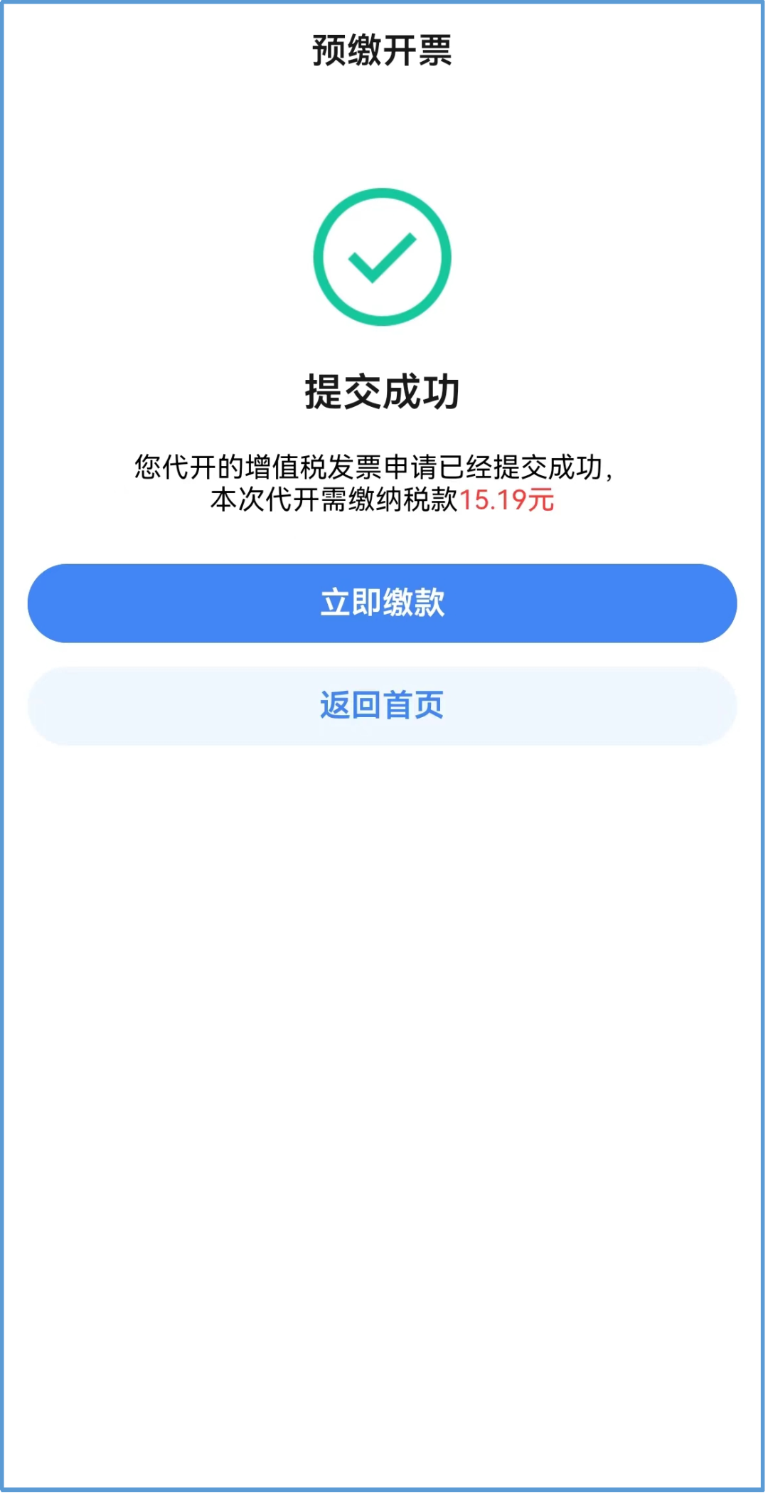 情况1:代开申请提交成功,无需审核,需缴款,跳转至预缴开票页面,缴款成功后,可自行开具数电普票;