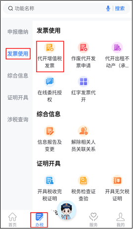 1.登录电子税务局APP后,点击【办税】—【发票使用】—【代开增值税发票】功能菜单。