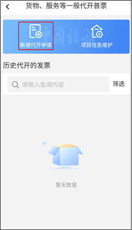 2.点击【货物、服务等一般代开】—【新增代开申请】进入代开申请页面。