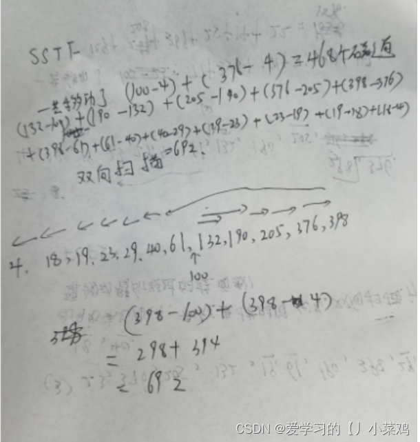 (3) 若磁头当前位于第100号柱面,且正向柱面号增加的方向移动。现有磁盘读写请求队列,柱面号依次为23,376,205,132,19,61,190,398,29,4,18,40。若采用先来先服务算法、最短查找时间优先算法和双向扫描算法,试计算出各种算法中移动臂所经过的柱面数。
