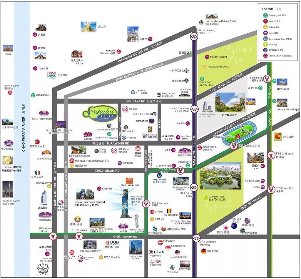 项目附近的世隆CBD区被誉为泰国的华尔街,周围环绕着:金融机构总部、各国大使馆、高端写字楼、超五星酒店,最高学府,顶级公立医院和私立医院,米其林餐厅和百年网红店,大型文创商场,湄南河景天际酒吧,著名夜市和热门酒吧街,MRT地铁站,BTS轻轨站,BRT快线,高速路口,地域可谓是全曼谷的无冕之王。