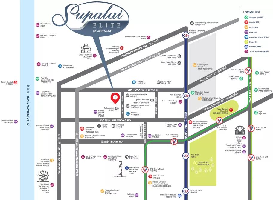 Supalai Elite @ Surawong距离MRT SamYan站850米,周边有多个BTS站和MRT站环绕,配合正高速发展的曼谷铁道网络,业主的出行将更加便捷,这里分布着诸多领事馆、五星级大酒店、国际一流学校和医院等。