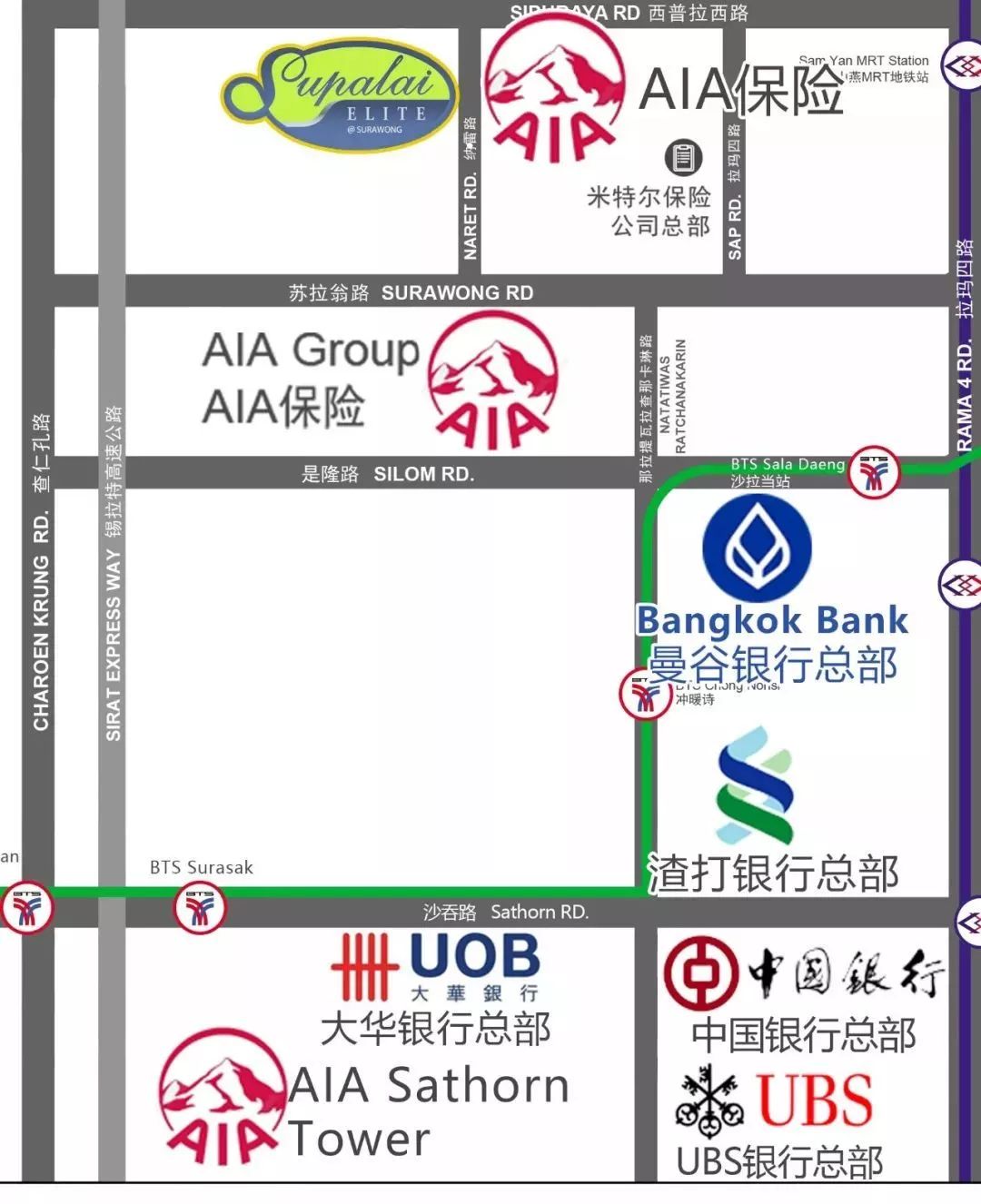 曼谷银行总部、渣打银行总部、中国银行总部、UBS银行总部、大华银行总部、AIA保险总部、美特尔保险总部等。