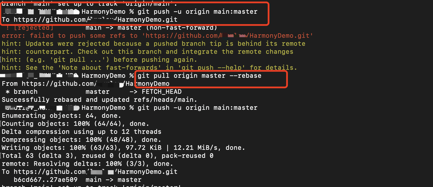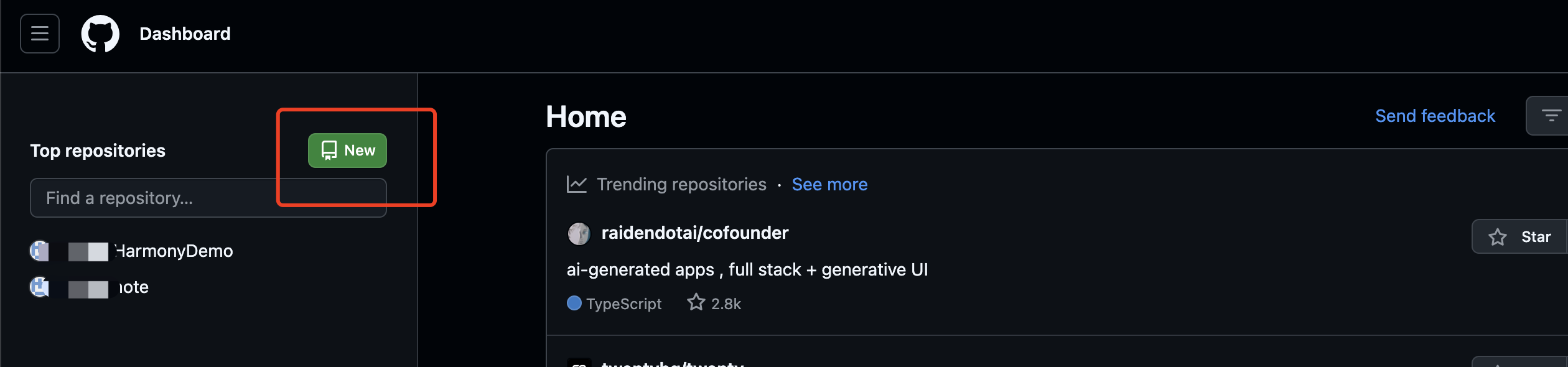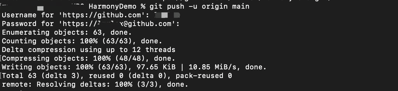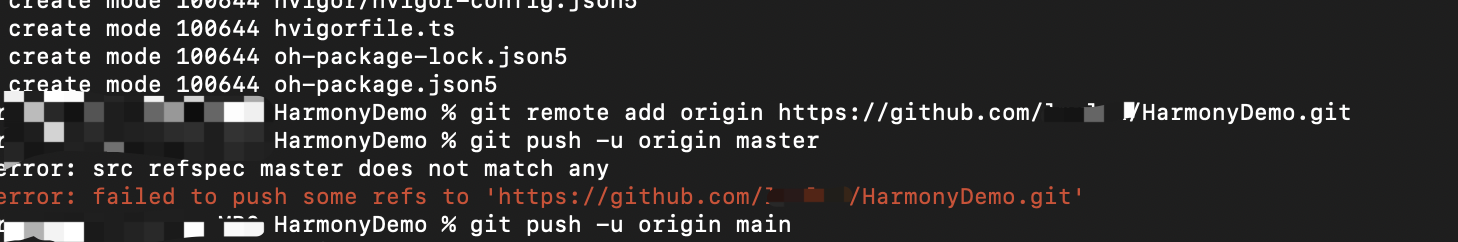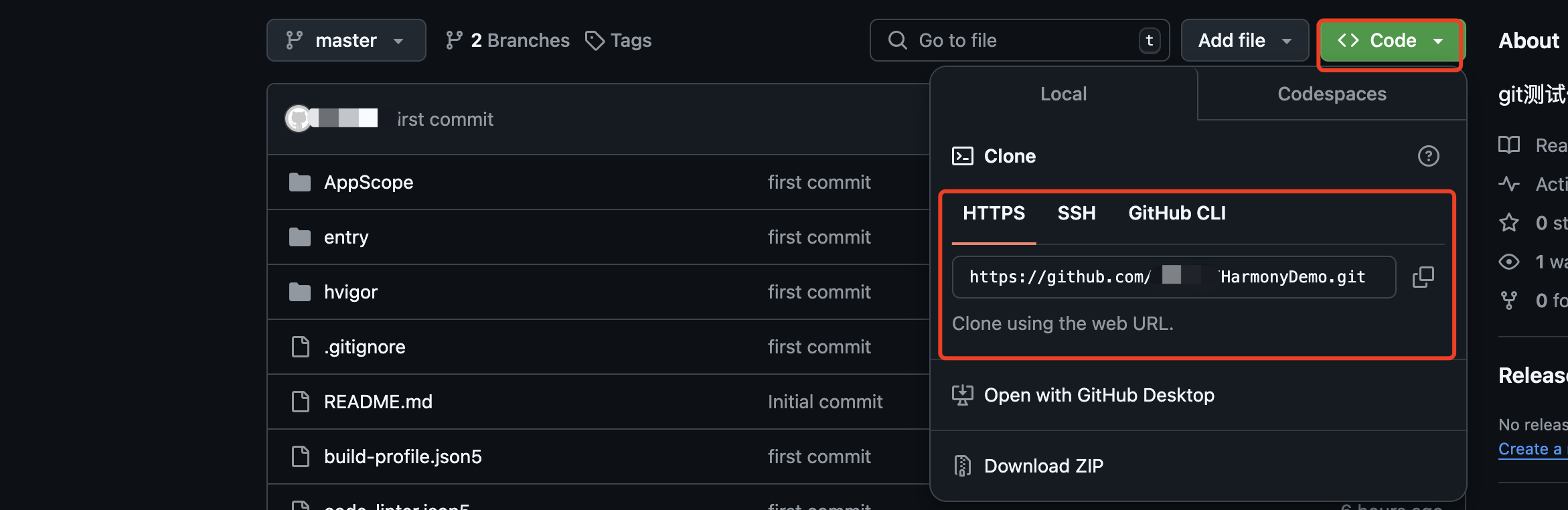 接下来使用 git remote add origin https://github.com/xxxx/HarmonyDemo.git 指令将远程仓库的url链接添加到本地仓库,这里的链接回到刚刚github创建的项目点进去有个code,https的字样,复制url替换就行